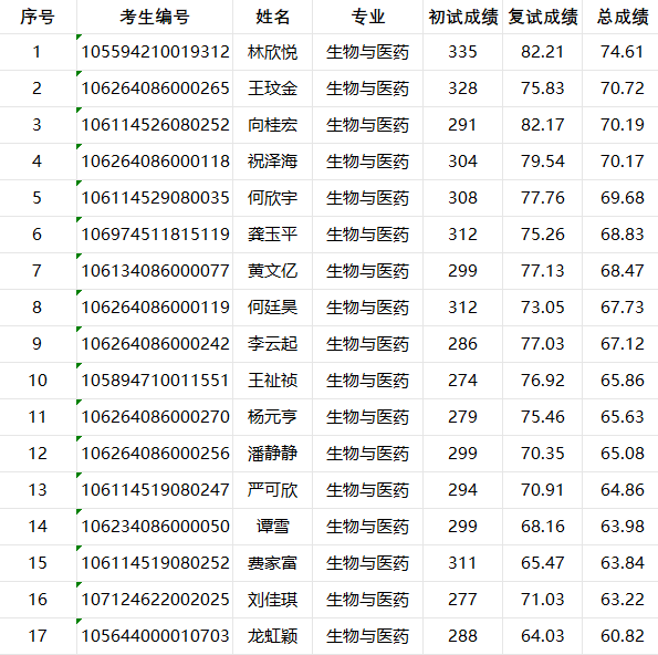 2024年生物与医药专业硕士研究生招生调剂考生复试成绩公示