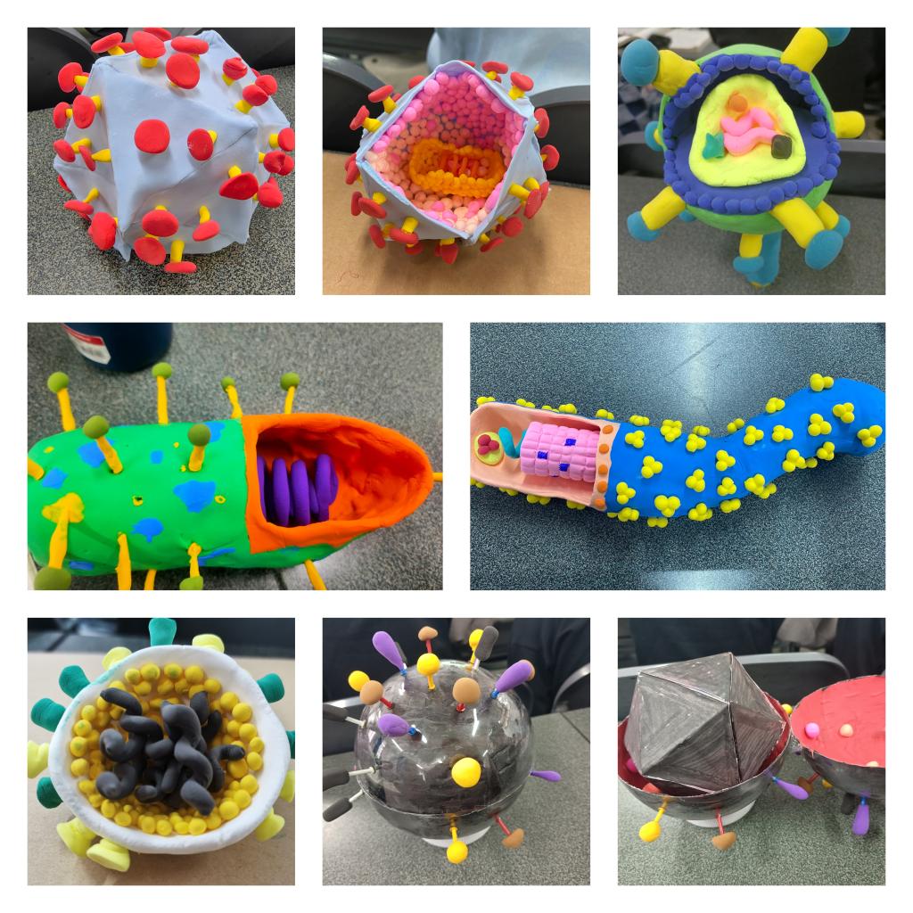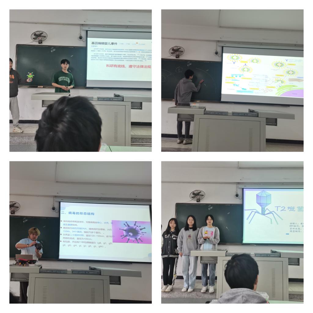 近期,在省级线上线下混合课病毒学最后一节课上,各个小组派代表汇报自己小组选择的个例病毒并展示病毒手工模型,由老师和其他组成员根据汇报情况、PPT制作、病毒应用最新研究进展和思政反思,结合本小组病毒模型等各方面评价指标给小组评分,最终评选出一等奖一名,二等奖二名,三等奖三名……精彩的展示和细致的评价,标志着本门“特殊”的课程完美收官。