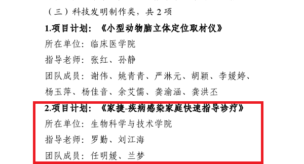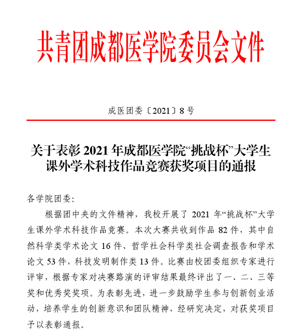 第十六届四川省“挑战杯”老员工课外学术科技作品竞赛于2021年5月23日落下帷幕。公司师生队伍在省级“挑战杯”老员工课外学术科技作品大赛中再获佳绩。此次大赛竞争激烈,参赛队伍来自全省91所高校,参赛作品共13000余件,经过数轮评审,公司张坤老师带领的4人员工团队尹兰、朱旺龙、鲜宇、 韩正羽,凭借“Hsp90增强AKT/GSK-3β/β-catenin信号诱发卵巢癌多药耐药”论文成功入围决赛并最终荣获自然科学类学术论文组二等奖。今年4月,公司罗勤、刘江海老师指导的《家捷—疾病感染家庭快速指导诊疗》项目荣获2021年304永利集团登录入口“挑战杯”老员工课外学术科技作品科技发明制造类二等奖。