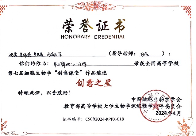 近日,中国细胞生物学学会2024年全国学术大会在福建省福州市举行,在其教学分会场同期举行的第七届细胞生物学“创意课堂”决赛中,公司304永利集团登录入口何浪老师指导,2022级预防医学专业同学创作的《氧化磷酸化一日游》和《这个纤毛不太摆》两个作品均获得“创意之星”奖。