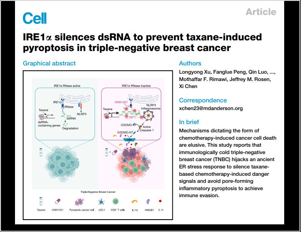 在Cell杂志最新发表的文章中,罗琴及其团队聚焦于三阴性乳腺癌(TNBC)的治疗,揭示了内质网应激传感器IRE1α在化疗诱导的炎性细胞死亡中的关键作用。研究团队发现,通过抑制IRE1α活性,可以增强化疗药物在免疫“冷淡型”的乳腺癌组织中诱发大量免疫细胞和T细胞浸润,从而发挥肿瘤免疫杀伤作用。这一发现为乳腺癌的治疗提供了新的策略,有望改善患者的预后。