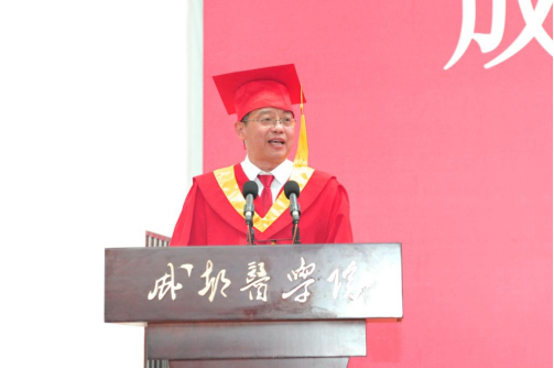 典礼上,公司党委副书记、经理、学位评定委员会主席潘克俭深情寄语毕业生,鼓励成医学子做踔厉奋发新青年。他提出三点希望:一是国际视野、中国灵魂,把“爱国之情强国之志”植入血脉;二是矢志向学、敏于行动,把“玉汝于成至善弘医”贯穿人生。在工作中树立成长型思维,做一个长期主义者;三是勇毅前行、乐观向善,把“博学博爱精益求精”融进生活。学会在承担责任的过程中培育成熟的心智,成为一个坚韧不拔的人。他借用白居易《赠梦得》一诗中的“此生三愿”:一愿世清平,二愿身强健,三愿数与君相见,希望同学们清楚自己肩负的责任,保持强大的内心,遇见所有的美好。
