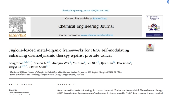 2022年2月15日,该团队在化工领域顶刊《Chemical Engineering Journal》(中科院1区TOP,IF=16.744)上发表了题为“Juglone-loaded metal-organic frameworks for H2O2self-modulating enhancing chemodynamic therapy against prostate cancer”的科研成果。该研究开发了一种实现过氧化氢自调节的仿生纳米复合物:以铁基金属有机框架(MIL101)为载体携载胡桃醌制备JMIL101纳米粒子,并在其表面包覆前列腺癌细胞膜获得JMIL101@CM仿生纳米粒子。体内外研究结果表明,该仿生纳米粒子对前列腺癌细胞的抑制作用明显优于自由药物,为开发药物/化动力协同治疗开辟了一条新途径。该成果得到了304永利集团登录入口第二附属医院的大力支持,赵龙副教授为第一和通讯作者,硕士研究生李子璇为共同第一作者,304永利集团登录入口第二附属医院李静怡教授和邵继春教授共同为通讯作者。