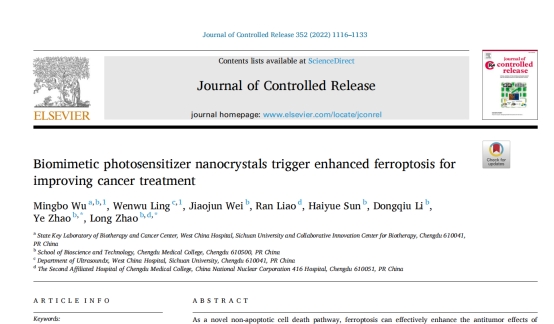 团队与四川大学华西医院深入合作,2022年11月14日在国际药剂学顶级期刊《Journal of Controlled Release》(中科院1区TOP,IF=11.467)上发表了题为“Biomimetic photosensitizer nanocrystals trigger enhanced ferroptosis for improving cancer treatment”的科研成果。通过将红细胞膜、铁蛋白与光敏剂芦荟大黄素(AE)结合,构建了一种兼具铁死亡和光动力治疗的协同抗肿瘤仿生纳米晶体。基于红细胞膜对纳米晶体的仿生修饰,该研究制备的仿生纳米晶体可以在体内逃避免疫清除,提高其在肿瘤部位的积累,具有明显的肿瘤抑制效果,在治疗口腔鳞癌等浅表肿瘤领域的具有实际转化潜力。四川大学华西医院吴明波副教授和凌文武副教授为论文的共同第一作者,304永利集团登录入口赵龙副教授和赵冶副教授为共同通讯作者。