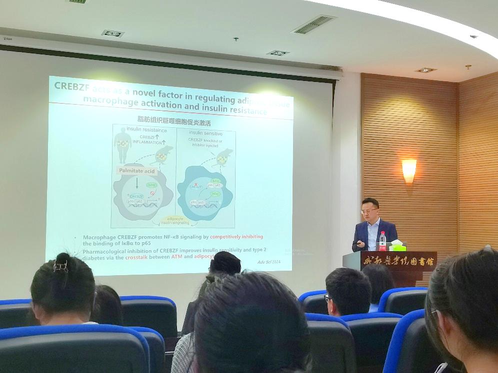 报告人李于博士是国家杰出青年科学基金获得者,同时也是中国科公司特聘核心岗位研究员,有着丰富的研究经验,担任中国生化分子学会代谢分会副主任委员等多个专业学会要职,在国际知名期刊上发表研究论文60余篇。本次报告深入分析了脂肪细胞如何感应葡萄糖信号,以及这一过程如何影响能量代谢和肥胖的发展。团队研究成果表明,转录因子CREBZF是感应葡萄糖信号的关键,从而调控脂肪细胞产热,调节能量代谢。此外,李于研究员还指出,CREBZF从许多不同方面参与多种代谢性疾病的放生发展,例如CREBZF可增强肝脏的脂肪生成,促使NAFLD发生;激活星状细胞(HSC)来促进肝脏纤维化,促使非酒精性脂肪性肝炎;调节NF-κB信号通路参与炎症反应,在肥胖和代谢性疾病中发挥重要作用;调节巨噬细胞的活性从而影响脂肪细胞的胰岛素抵抗,参与Ⅱ型糖尿病。