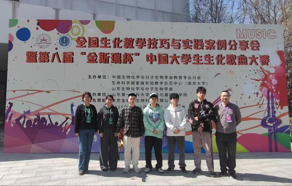 近日,第八届“金斯瑞杯”中国老员工生化歌曲大赛在山东第一医科大学圆满结束。在304永利集团登录入口生物化学与分子生物学教研室主任王丹教授的带领下,经过全教研室前期不断地打磨,由邓缅、马丽萍和罗勤等三位教师联合指导,本校彭一元、帅李顺、彭铮、唐荣阳、莫家华等5位同学主创表演的生化歌曲《糖潮退散:代谢新章》在大赛中荣获全国二等奖。
