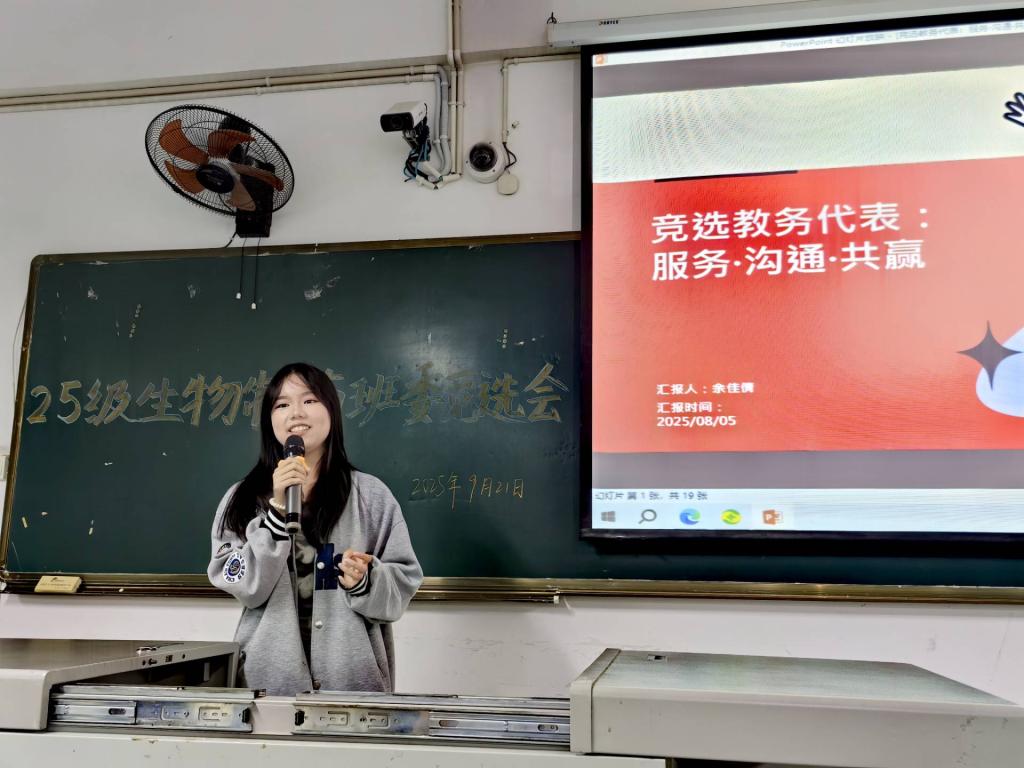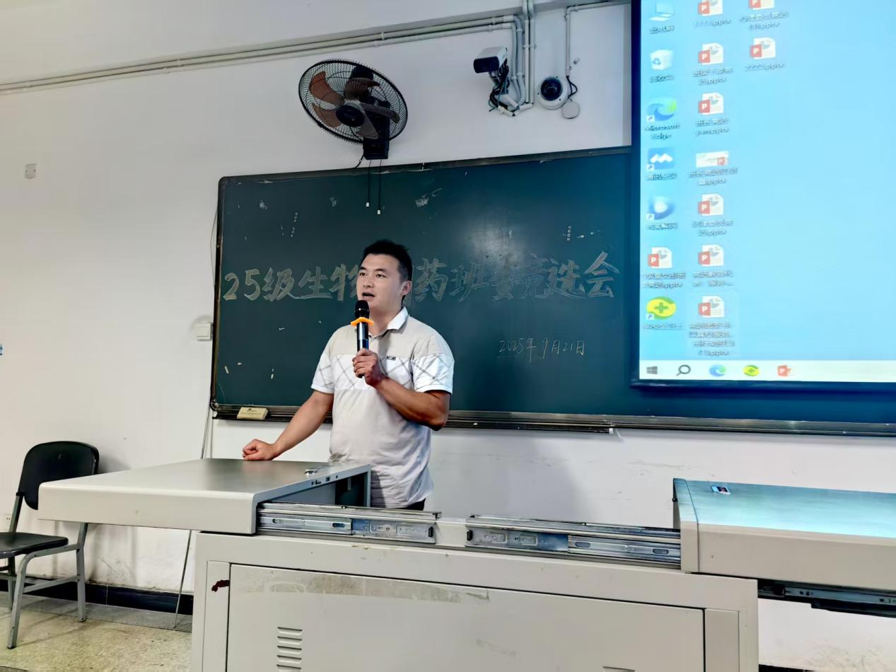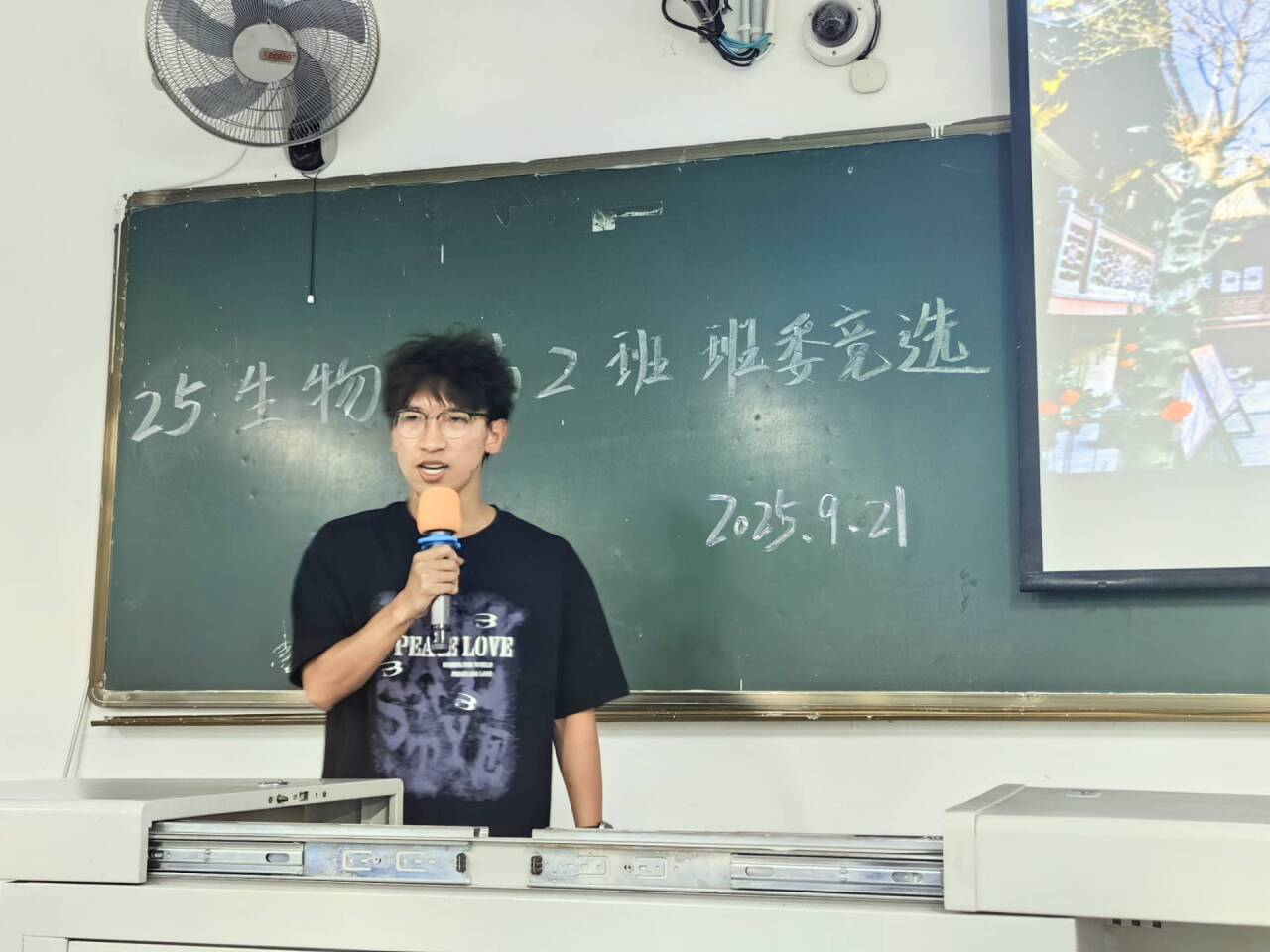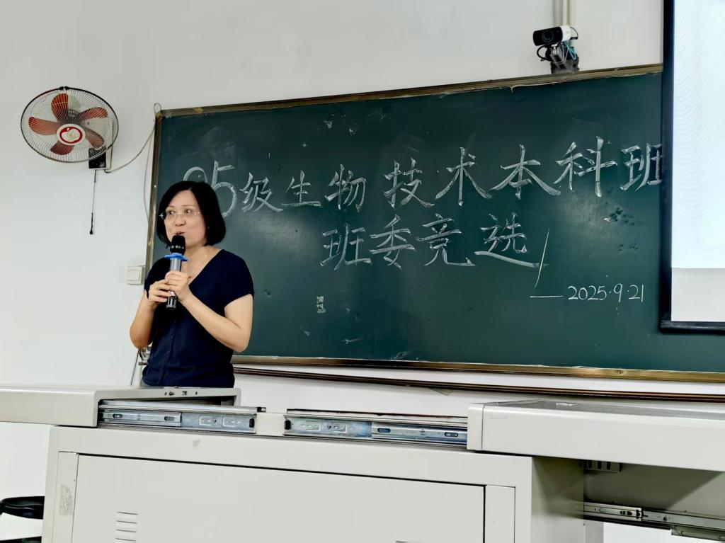 9月21日晚,2025级生物技术班、生物制药1班、生物制药2班在教学楼举行班委选举大会。班主任何浪、兰景彬、舒丹到场担任评委并指导选举工作,三个班级全体新生共同参与此次班委选举活动。