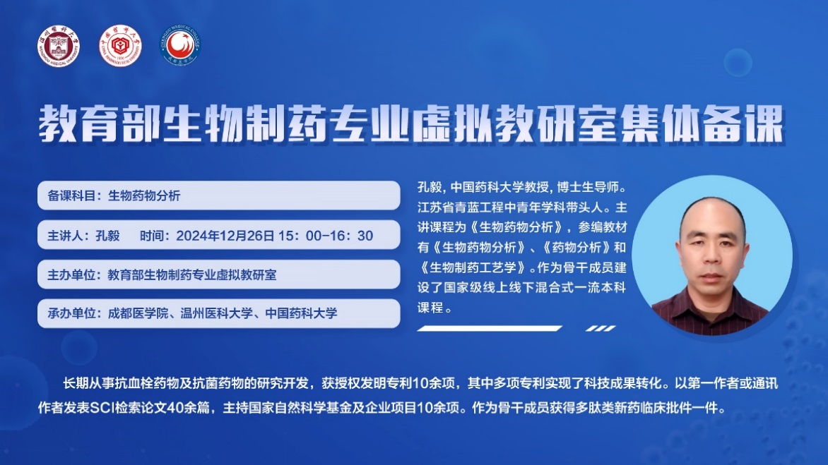 12月26日下午,教育部生物制药专业虚拟教研室集体备课在公司公司举行。本次集体备课在教育部药学类专业教指委生物制药专业分教指委指导下,由304永利集团登录入口、温州医科大学、中国药科大学共同承办,采用线上线下相结合的方式进行,共同探讨和分享《生物药物分析》课程的教学经验与创新思路,集思广益,促进优质教学资料共享。