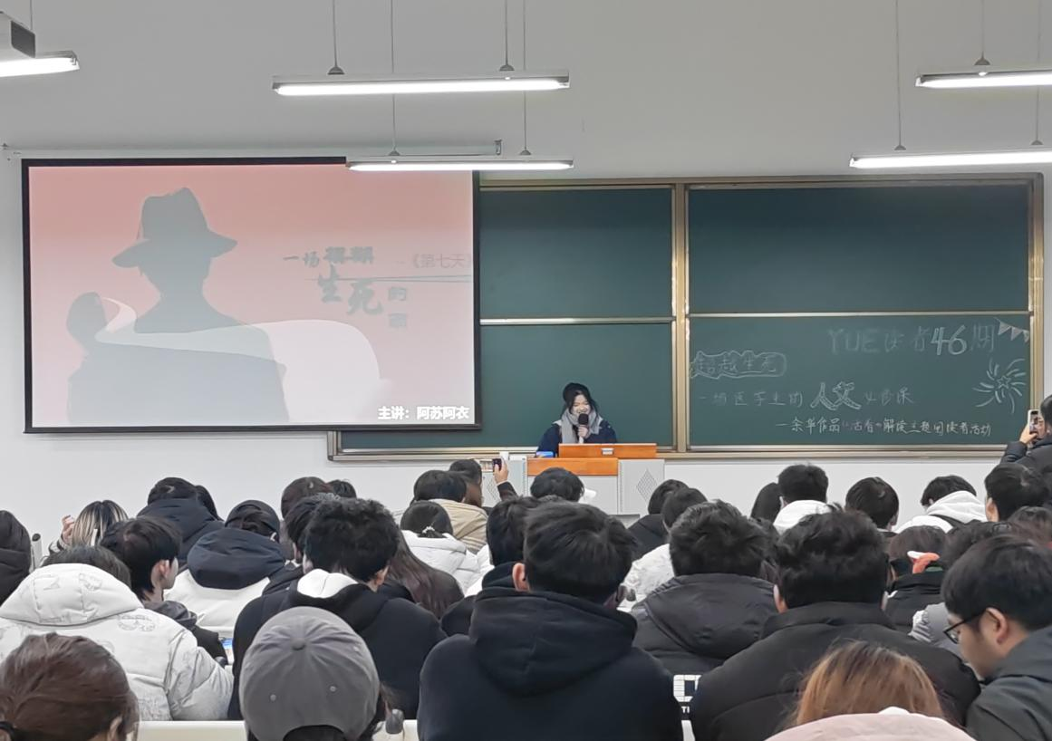 阿苏阿衣同学则分享了《第七天》的阅读感悟,以书中荒诞却饱含温情的叙事为切入点,探讨了生命存续的多元意义,让大家对“死亡之外的精神延续”有了全新思考。两位同学的分享视角独特、情感真挚,赢得了现场阵阵掌声。